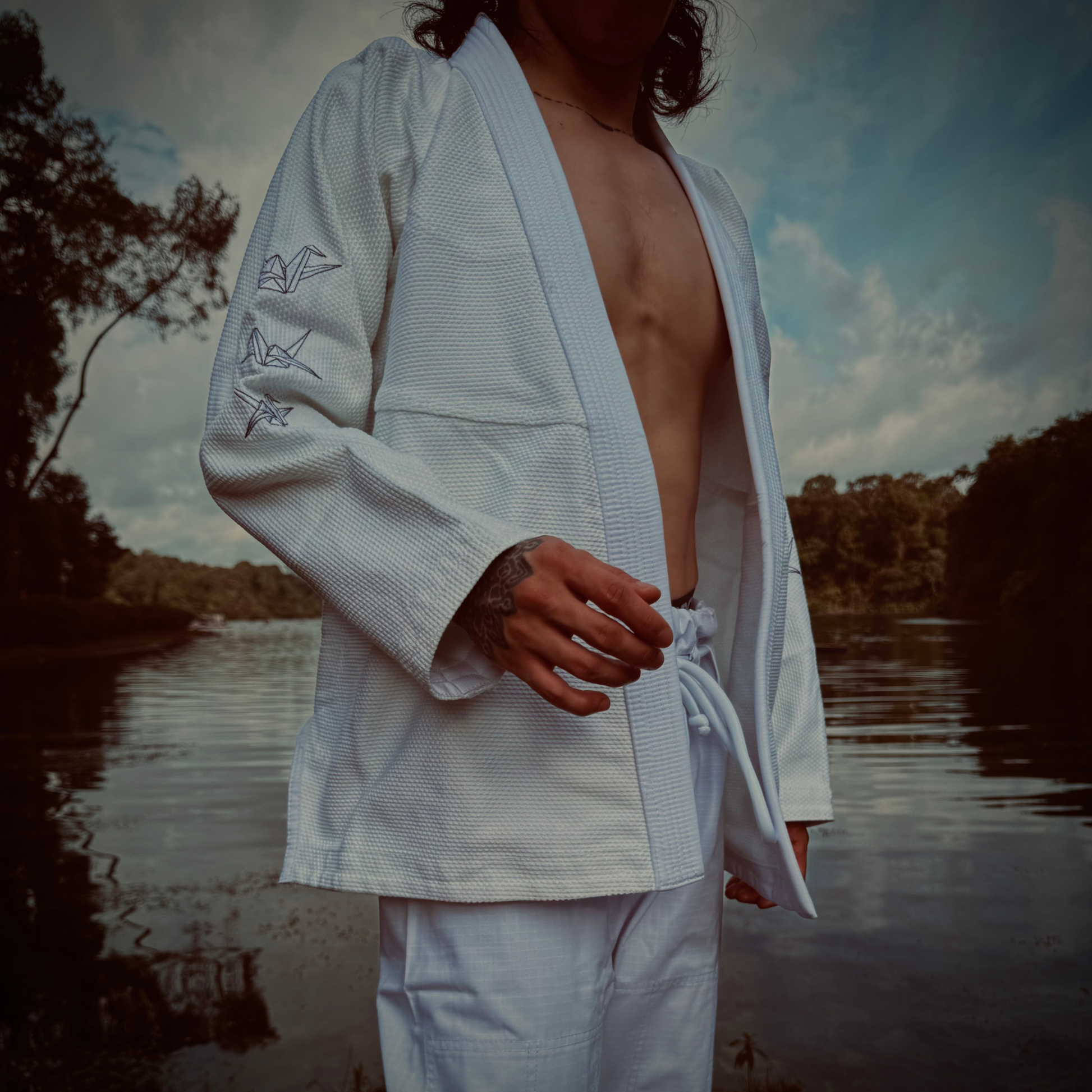 Visually, the gi is a work of art. Featuring elegant embroidered paper cranes in mid-flight and koi fish swimming upstream, the design channels traditional Japanese aesthetics with a modern edge. Each motif is a nod to the journey—through struggle, toward mastery.